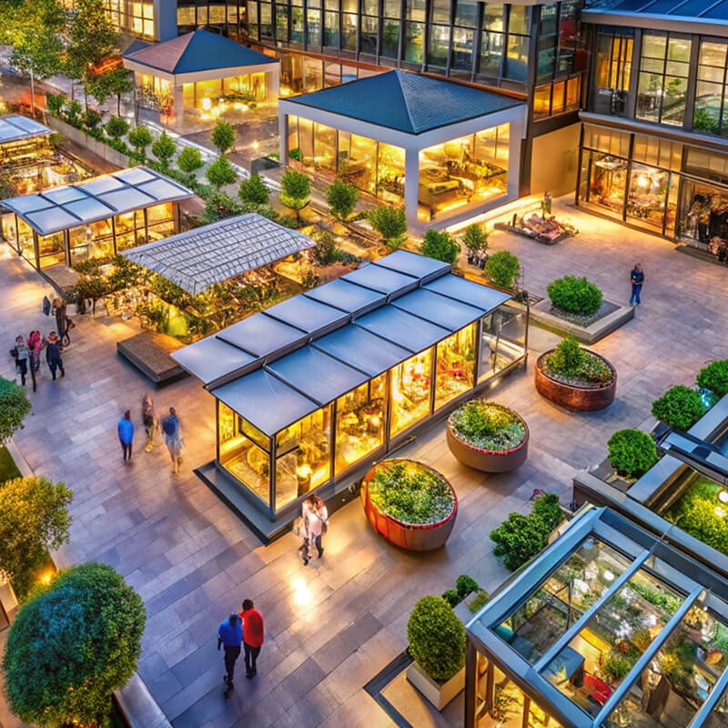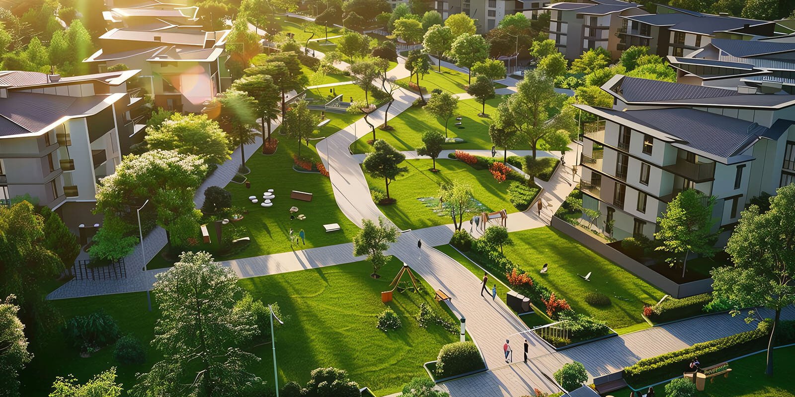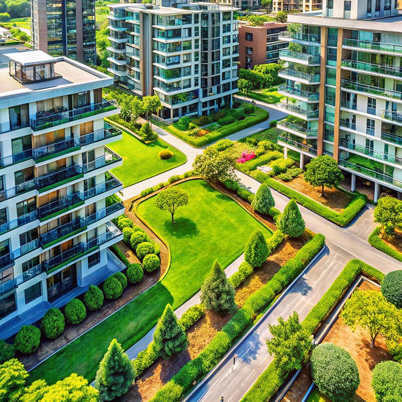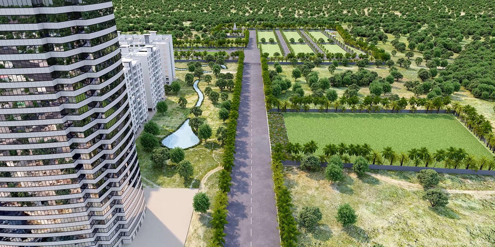 Over 70 % green and open area, including meditation courtyards, tree-lined boulevards, and reflection zones.