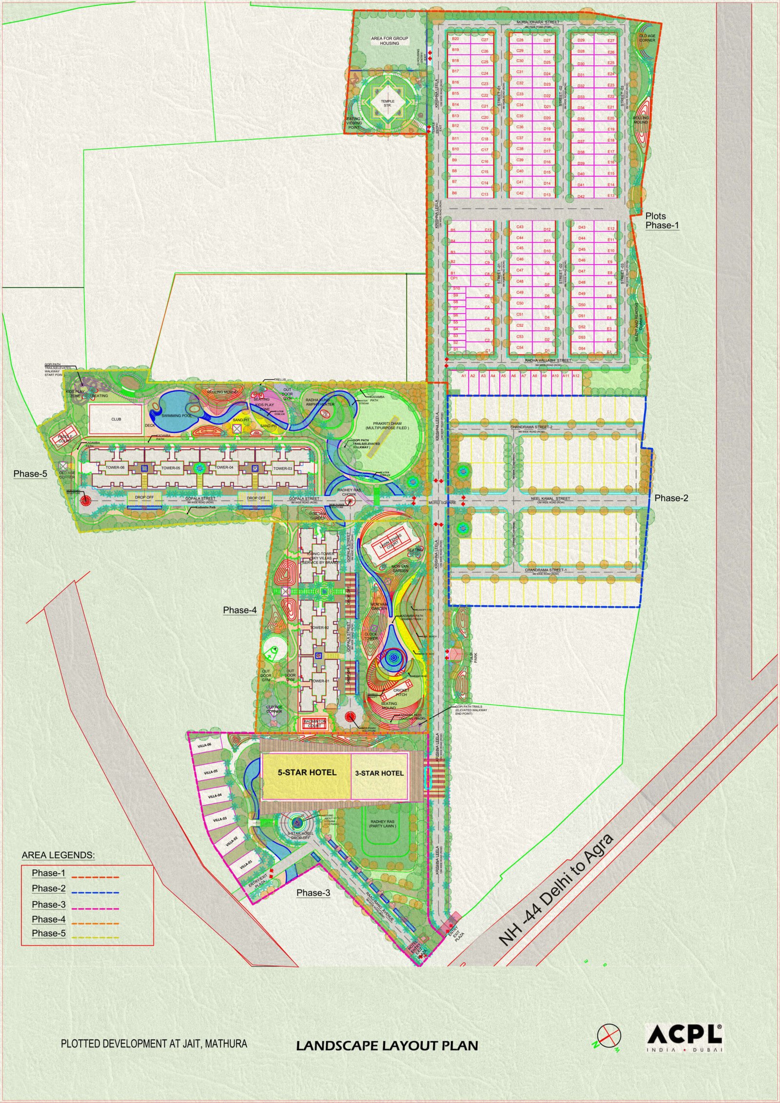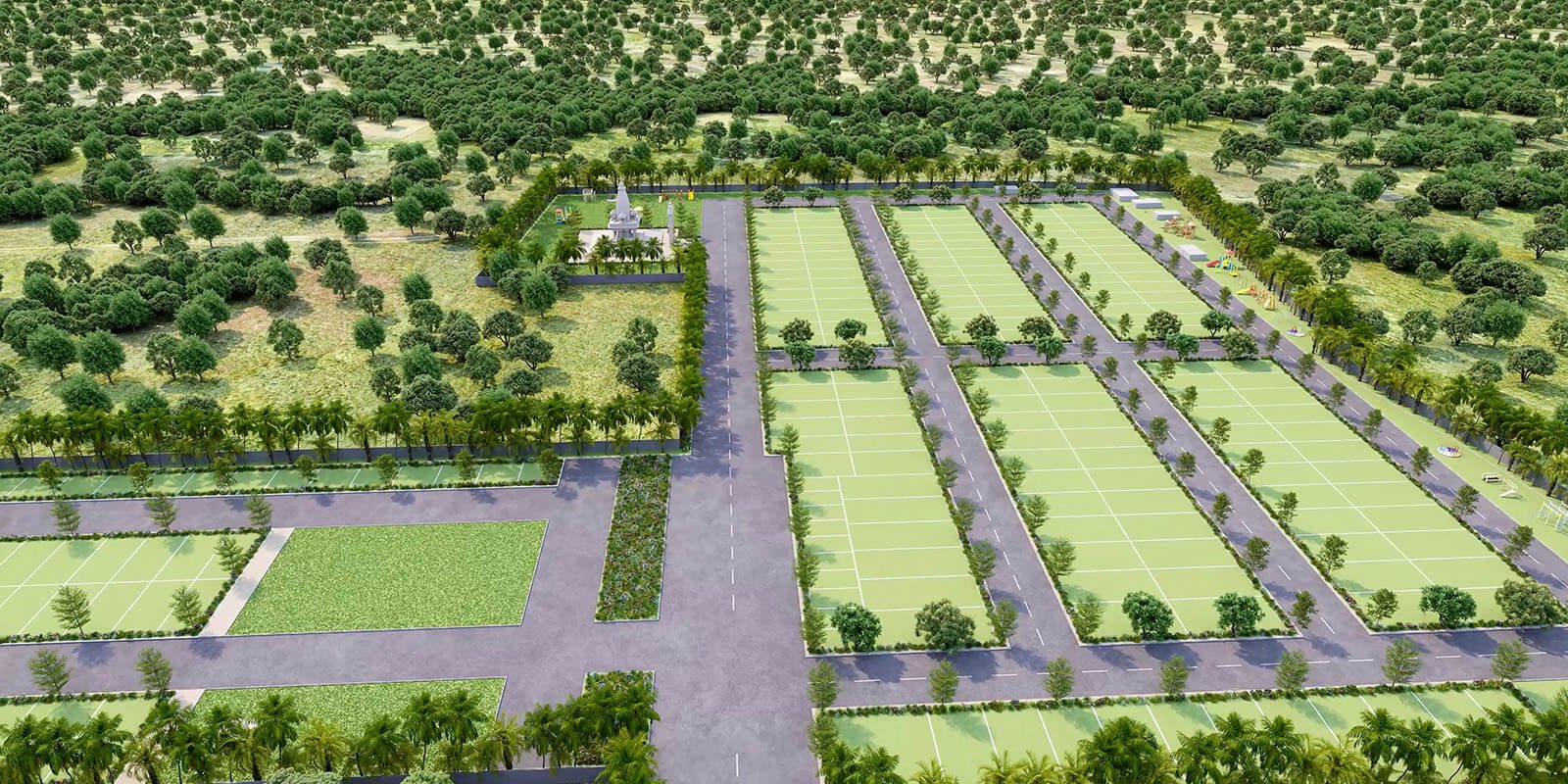 This master layout reflects a balanced township design — with residential plots, RCC roads, landscaped parks, and community spaces.